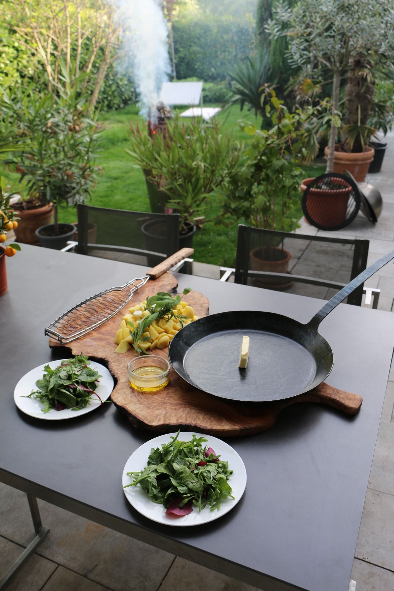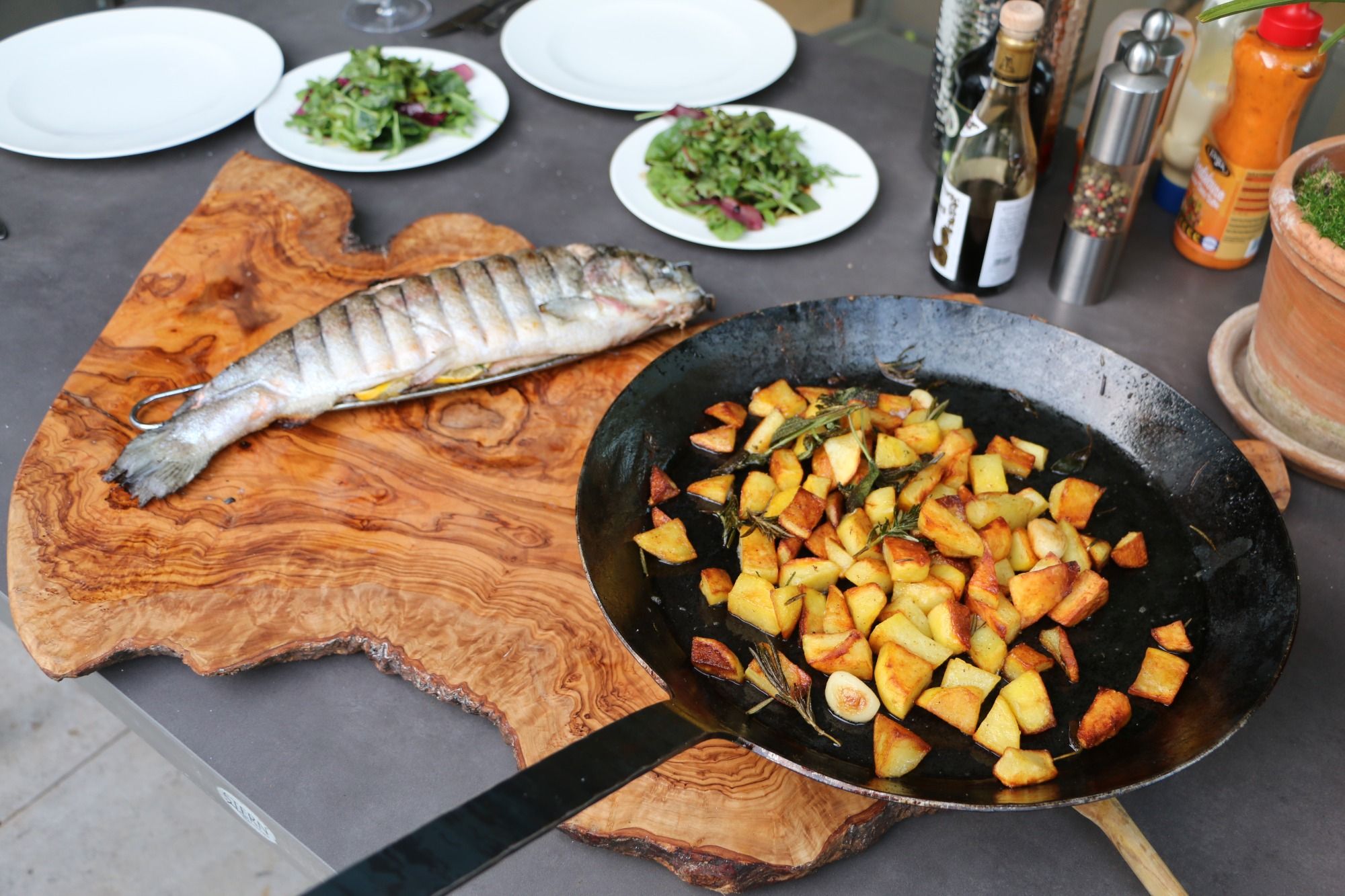 Wenn die Kartoffeln fast fertig gebraten sind, zur Seite stellen und den Fisch in der Grillzange aug den Grill legen, je nach Grösse pro Seite 7 - 10 Minuten braten, häufiger wenden.