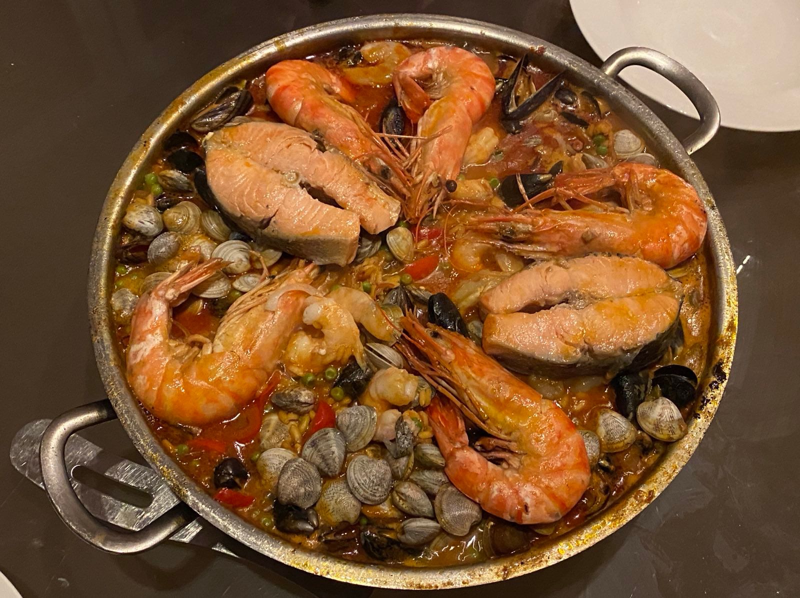 Ca. 6 Minuten bevor die Paella vom Feuer kommt, erst die Muscheln und die Deko Pakrikastreifen Erbsen dann die Garnelen reingeben bis sie warm geworden sind, nicht rühren, weil dann nicht mehr schön aussieht.